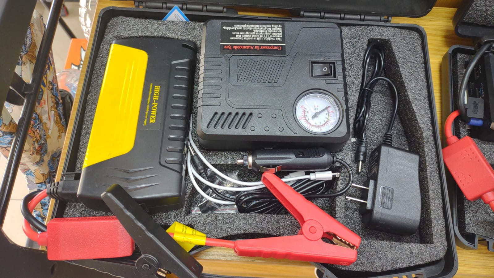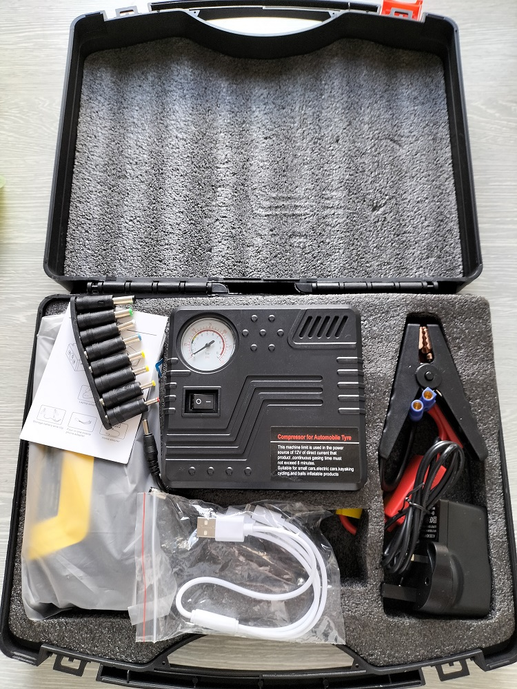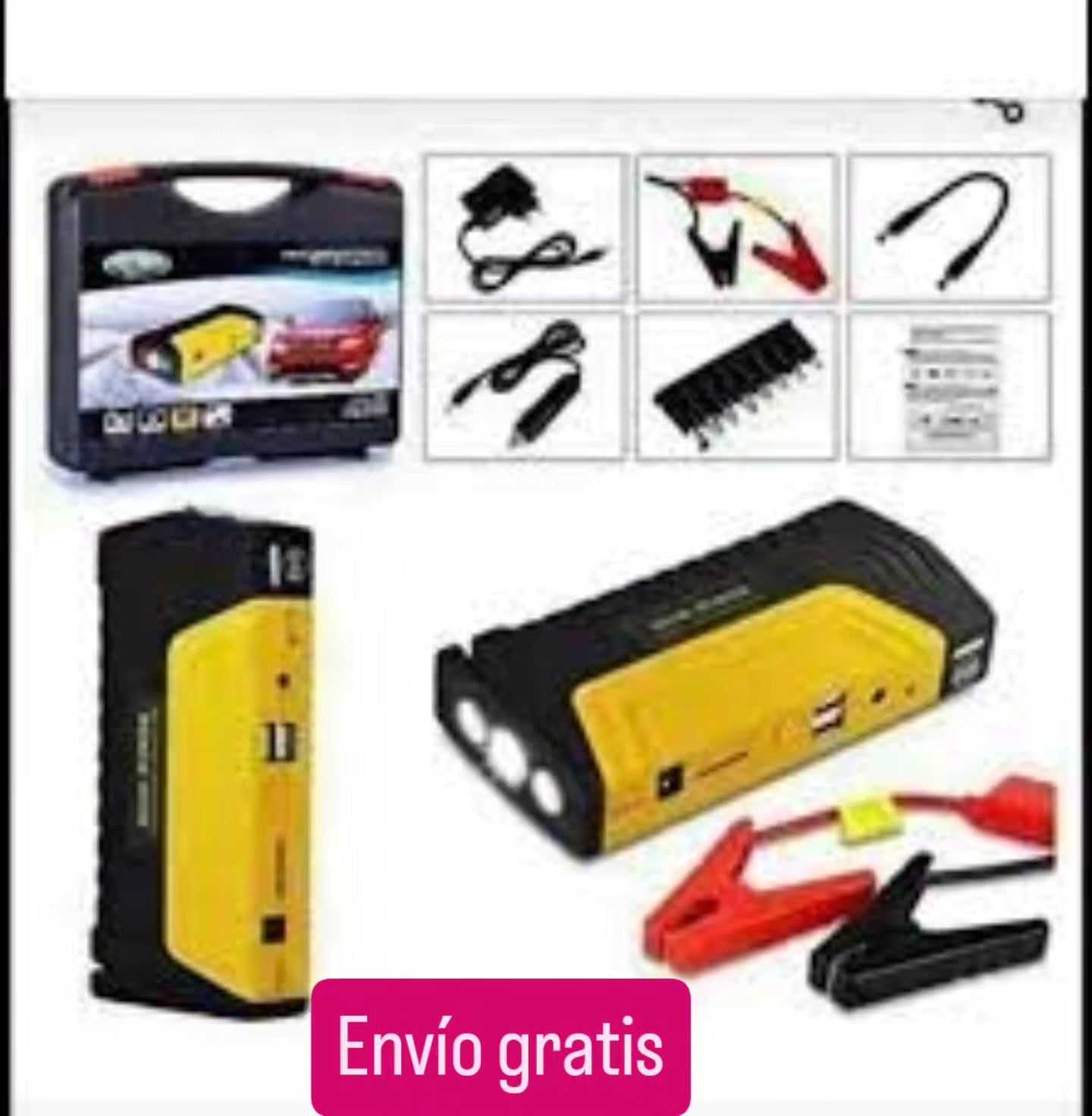 Este kit multifunción todo en uno es indispensable para llevar en tu auto: no solo te permite encender el vehículo cuando la batería falla, sino que también funciona como cargador portátil para dispositivos electrónicos y cuenta con una potente bomba de aire de 150 PSI, ideal para inflar neumáticos, pelotas y más. Todo en un solo equipo compacto, resistente y fácil de transportar.