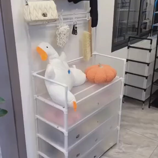 Aprovecha mejor cada espacio de tu hogar con el Organizador Multifuncional con Gavetas y Perchero. Ideal para entrada, habitación o vestidor, combina almacenamiento cerrado y ganchos superiores para mayor orden.