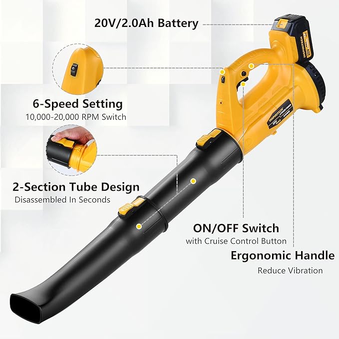 - Un soplador de hojas inalámbrico con opciones de ajuste de 6 velocidades: este soplador inalámbrico Inspiritech tiene un ajuste de 6 velocidades, por lo que puedes hacer ajustes en función de los desechos que necesitas limpiar. Este soplador de hojas de batería tiene un botón de control de crucero que te permite manejarlo más fácilmente sin necesidad de seguir presionando el gatillo todo el tiempo.