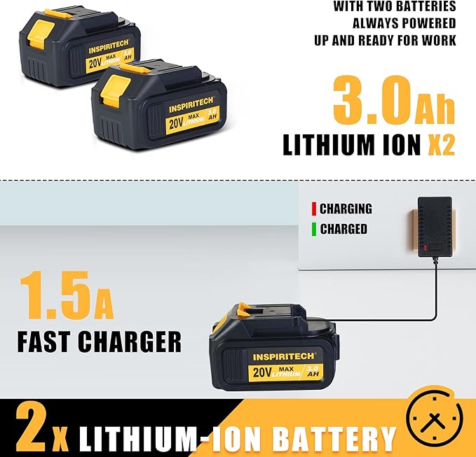 - 📌【Te respalda con 2 baterías y cargador】 Al ejecutar un soplador de hojas que funciona con pilas en su ajuste más alto drenará su batería rápidamente, por lo que te respaldamos con dos baterías. Con la batería de iones de litio Inspiritech MTB2030 de 20 V y 3,0 AH, este soplador de hojas de mano inalámbrico puede funcionar hasta 180 minutos a baja velocidad y 15 minutos a su máxima velocidad. Dos baterías te permiten cambiar en el trabajo medio.